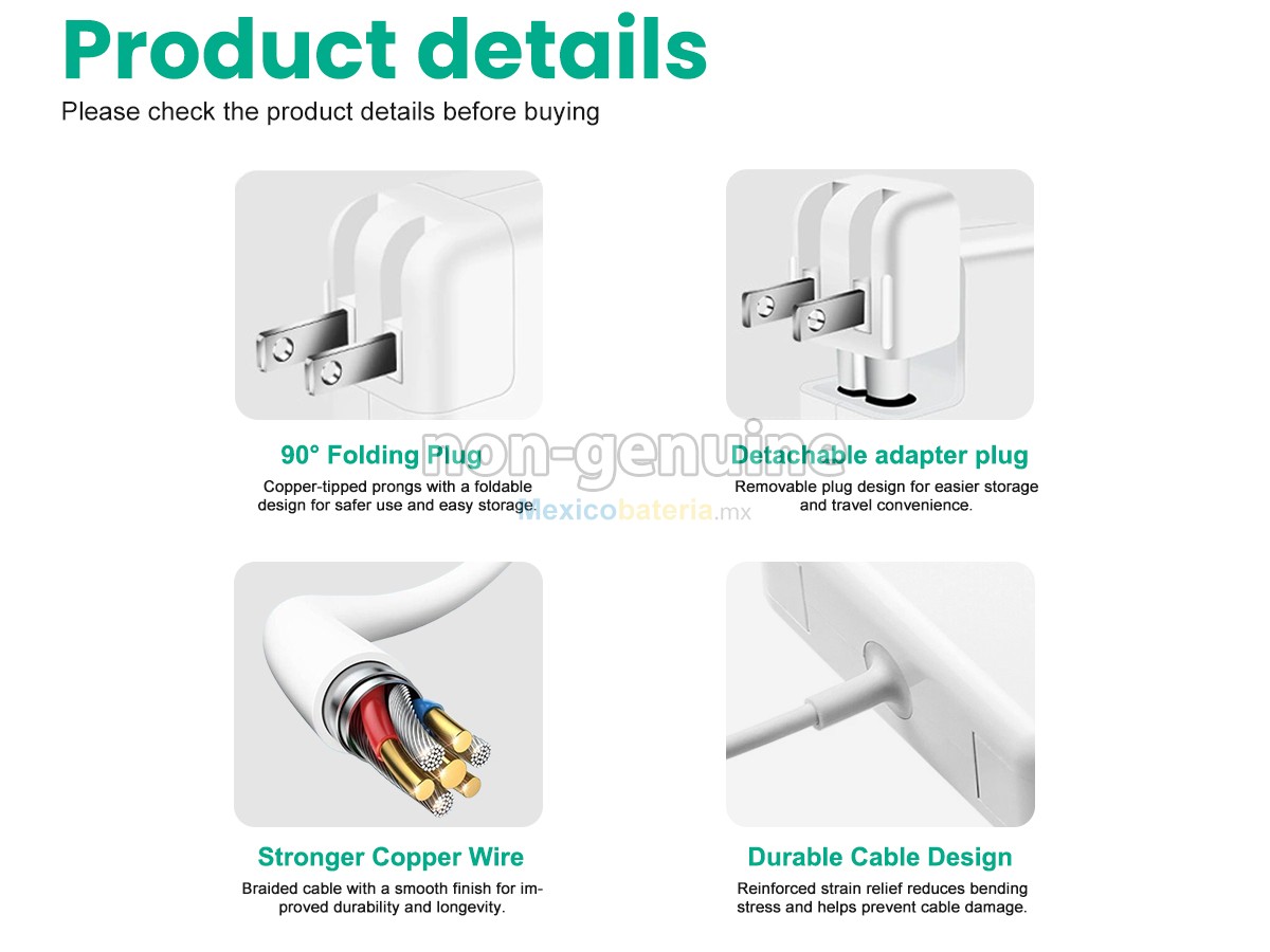 Nuestro adaptador para Apple 45W MAGSAFE A1244 ofrece una excelente compatibilidad y durabilidad. Cada uno de nuestros adaptadores está fabricado bajo estrictos estándares de calidad, garantizando un uso prolongado, estable y eficiente en términos de energía. A diferencia de los adaptadores comunes del mercado, nuestros productos están diseñados para prolongar la vida útil de la batería y optimizar la gestión de energía, brindando un ajuste perfecto para las necesidades de tu equipo.
