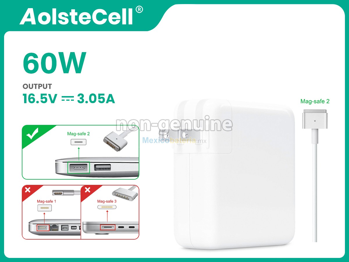 Nuestro adaptador para Apple MAGSAFE 2 60W ofrece una excelente compatibilidad y durabilidad. Cada uno de nuestros adaptadores está fabricado bajo estrictos estándares de calidad, garantizando un uso prolongado, estable y eficiente en términos de energía. A diferencia de los adaptadores comunes del mercado, nuestros productos están diseñados para prolongar la vida útil de la batería y optimizar la gestión de energía, brindando un ajuste perfecto para las necesidades de tu equipo.