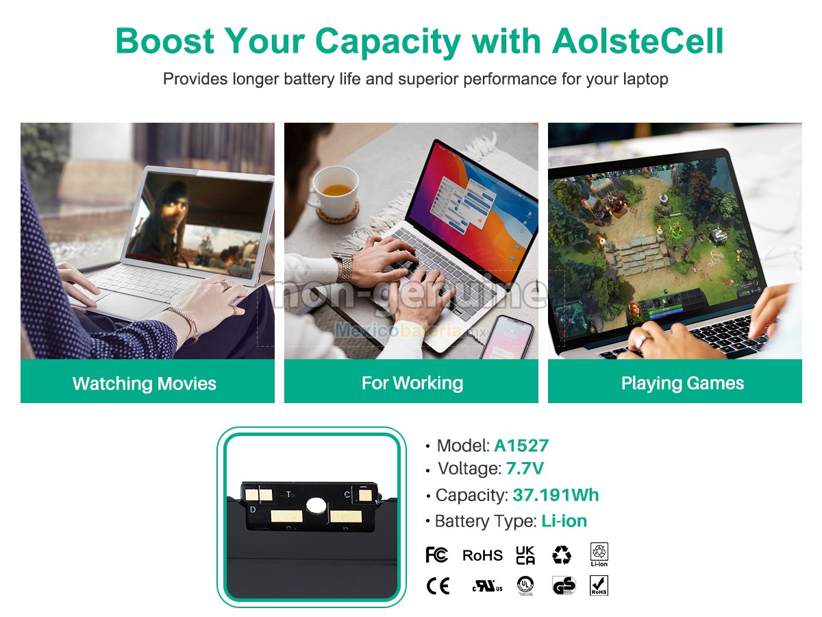 Mexicobateria.mx vende baterías de alta calidad, garantizamos su compatibilidad y mejora del rendimiento de la batería original. Nuestras Apple MK4N2LL/A batería se producen de acuerdo con los estándares más exigentes y, luego de estrictos procesos de selección y control de calidad, cumple con la Norma CE. Ofrecemos la batería con una mayor capacidad a un precio muy competitivo, su puerto es de material aislado metálico y sólido de alta calidad para garantizar una entrada de corriente estable y su durabilidad. La mejor batería depende de su marca, precio y variedad, en Mexicobateria.mx puede tener todos estos, el producto se envia desde México y 100% seguros para comprar.