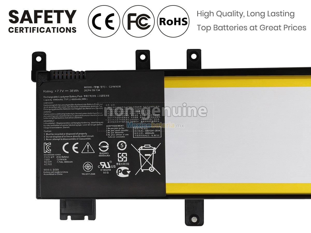 - Todas nuestras Asus C21N1638(2ICP4/59/134) batería compatibles para portátil cuentan con los certificados de CE, UL, ROHS, ISO9001/ 9002, sus diseños cumplen o superan los requisitos de la norma OEM, son productos seguros, 100% seguros para comprar.