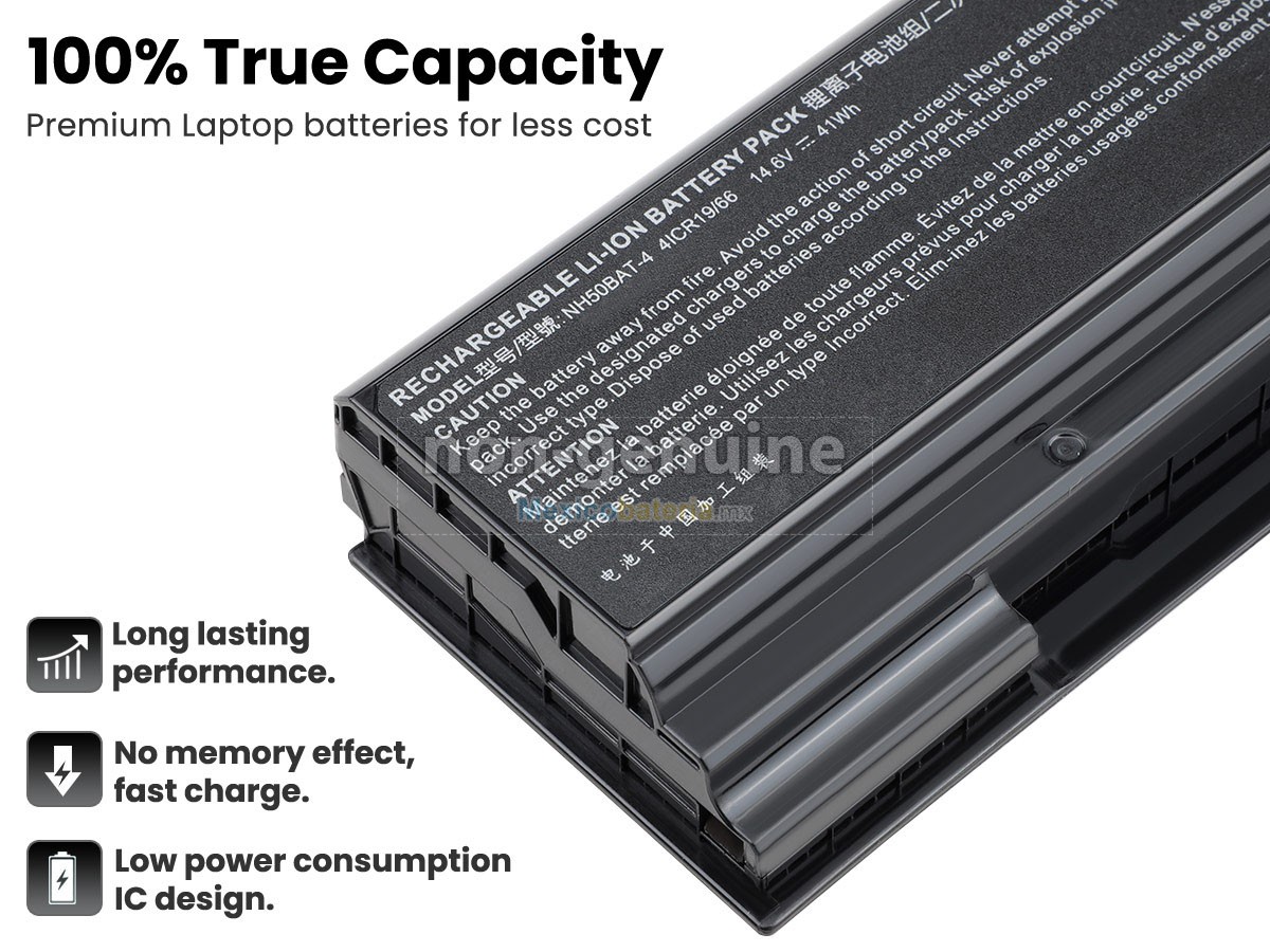 Características de nuestra batería compatible Clevo NH50RC:- Cada una de nuestras Clevo NH50RC batería está fabricada con batería de iones de litio de alta calidad, 100% nueva, suministrada directamente por el fabricante y a mejor precio, con celda seleccionada de alta calidad para un rendimiento seguro de confiable.