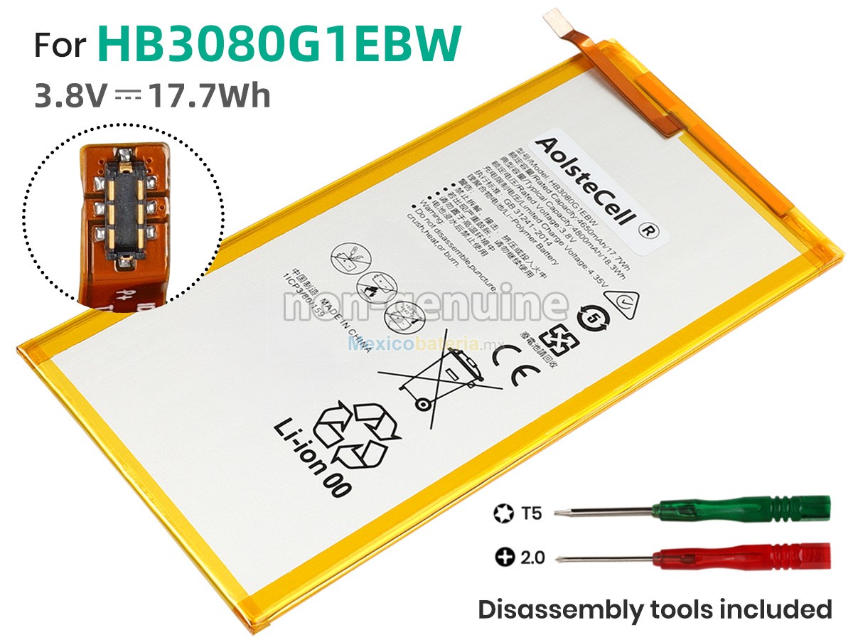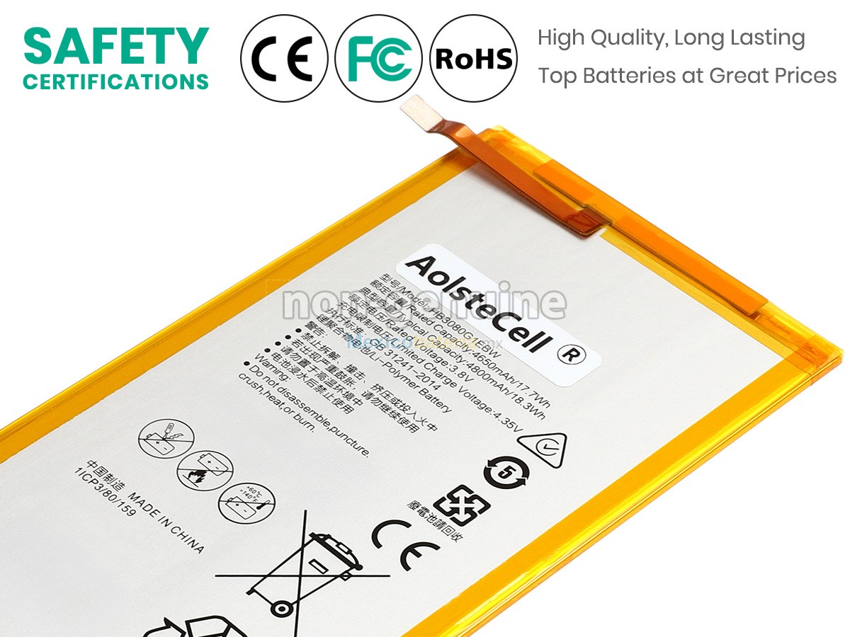 - Todas nuestras Huawei MEDIAPAD T3 8.0 batería compatibles para portátil cuentan con los certificados de CE, UL, ROHS, ISO9001/ 9002, sus diseños cumplen o superan los requisitos de la norma OEM, son productos seguros, 100% seguros para comprar.