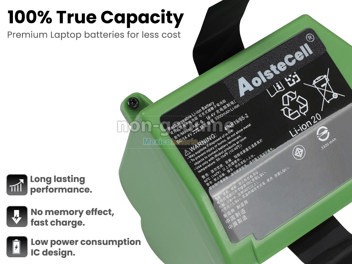 Características de nuestra batería compatible Irobot ABL-B:- Cada una de nuestras Irobot ABL-B batería está fabricada con batería de iones de litio de alta calidad, 100% nueva, suministrada directamente por el fabricante y a mejor precio, con celda seleccionada de alta calidad para un rendimiento seguro de confiable.