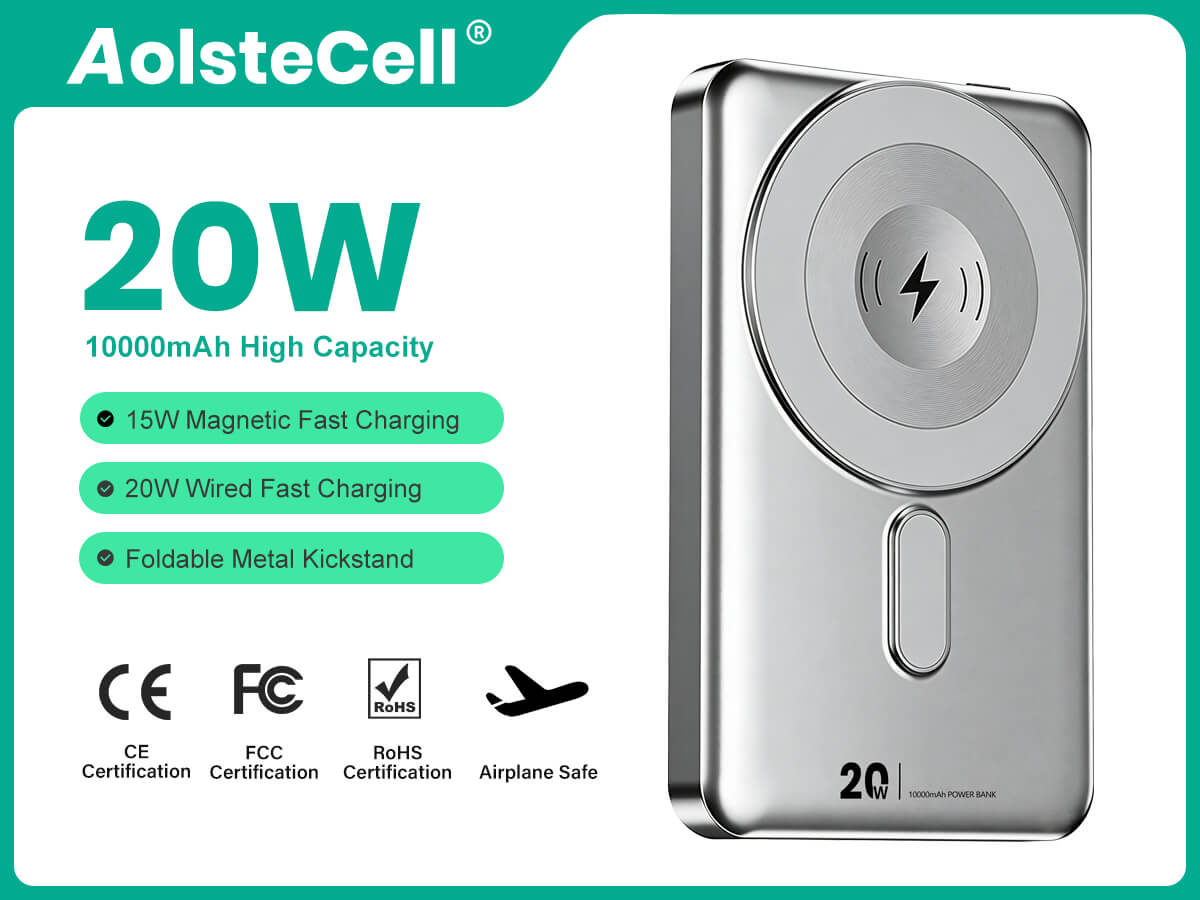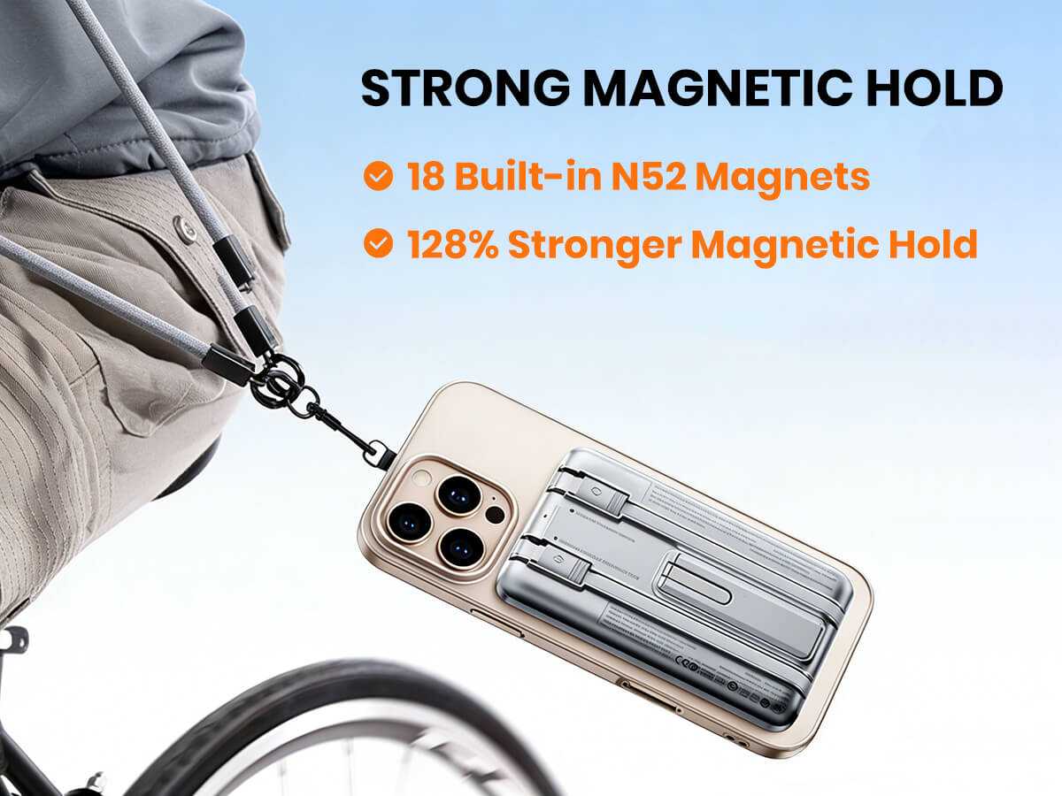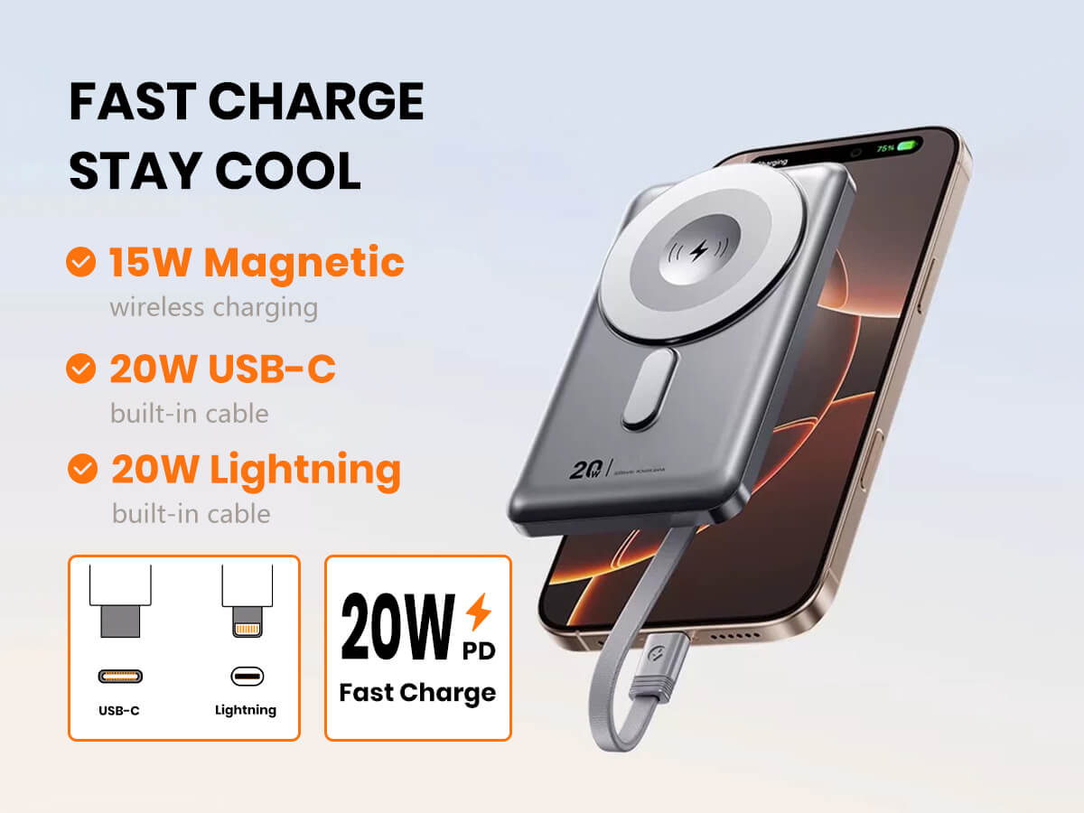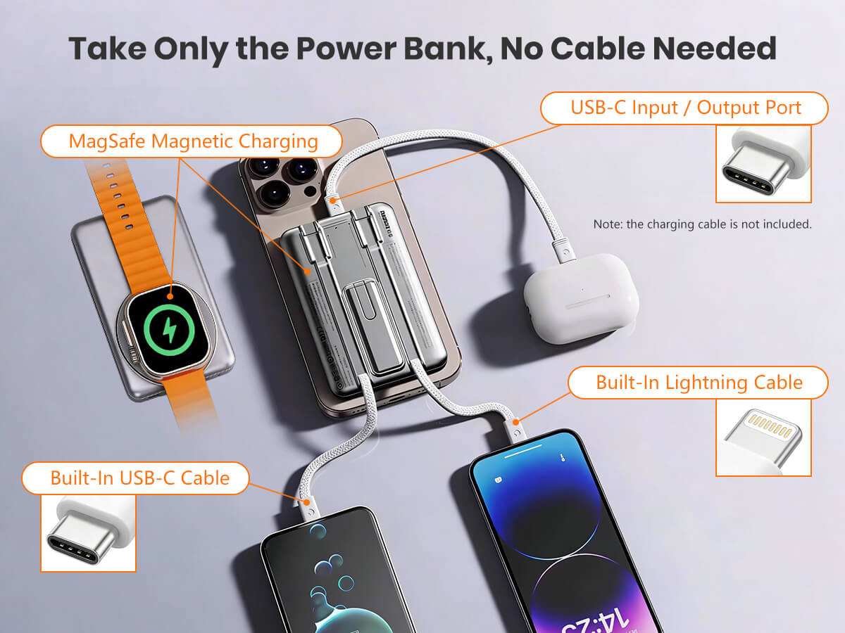 Este power bank multifuncional está diseñado para cargar hasta cuatro dispositivos a la vez. Incluye carga inalámbrica magnética de 15W, cable USB-C integrado, cable Lightning integrado y un puerto USB-C adicional, para que puedas cargar varios equipos sin necesidad de llevar cables extra.