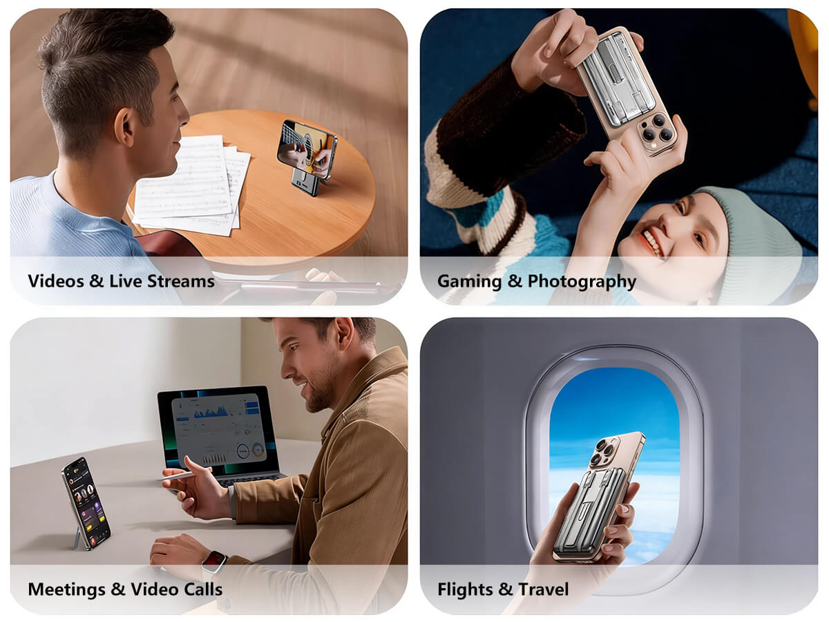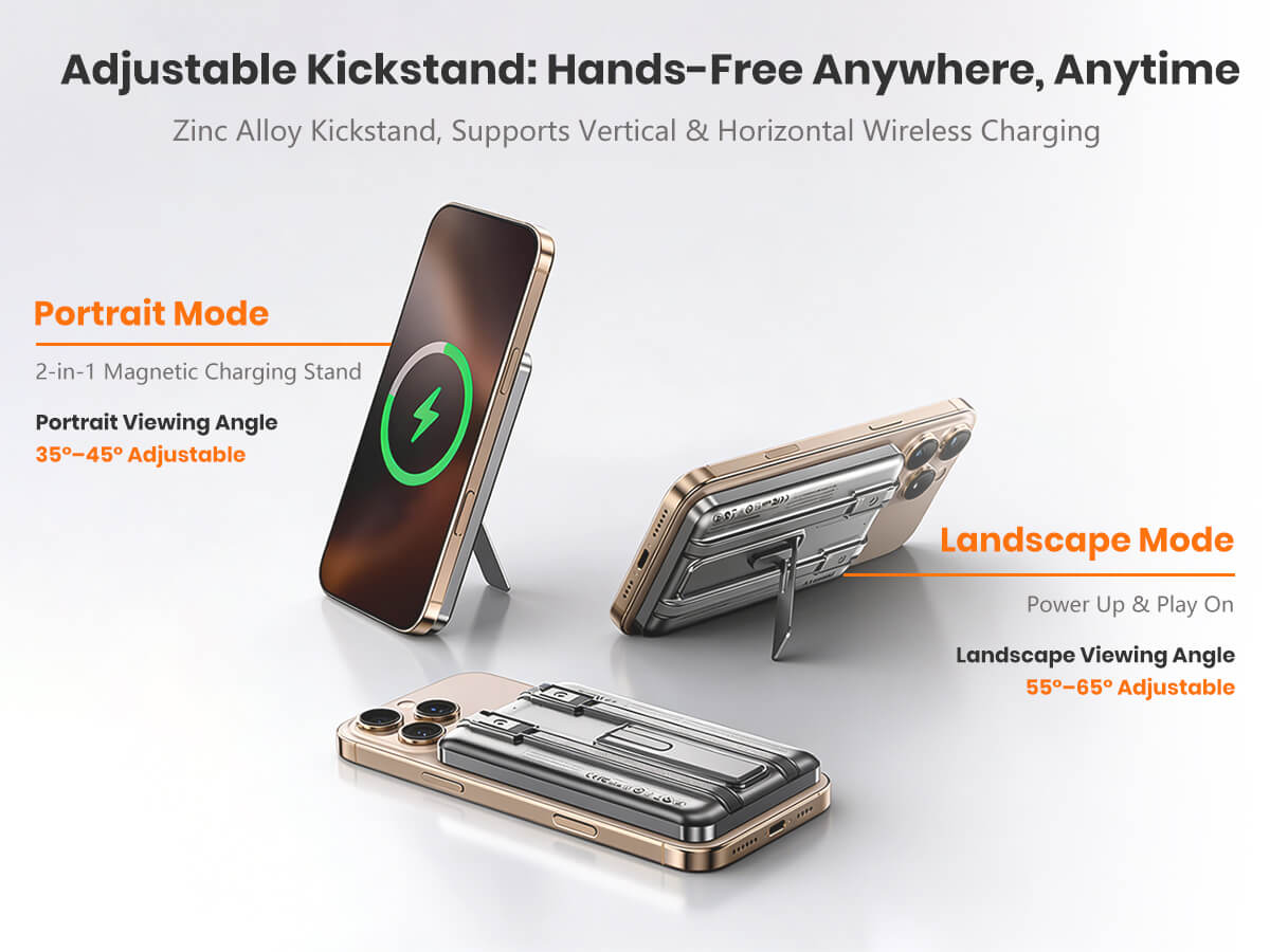 El soporte plegable integrado permite colocar el teléfono en posición vertical u horizontal mientras se carga. Es ideal para ver videos, hacer videollamadas o revisar mensajes sin tener que sostener el celular.