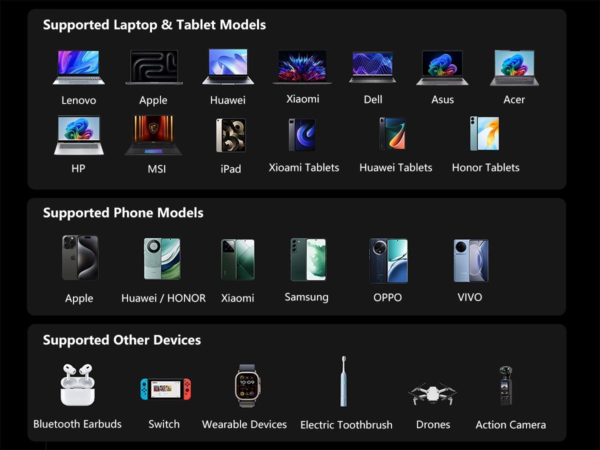 Perfetta per laptop, tablet, smartphone, console portatili, droni, action cam, auricolari Bluetooth e tanto altro – il compagno ideale per lavoro e viaggi.