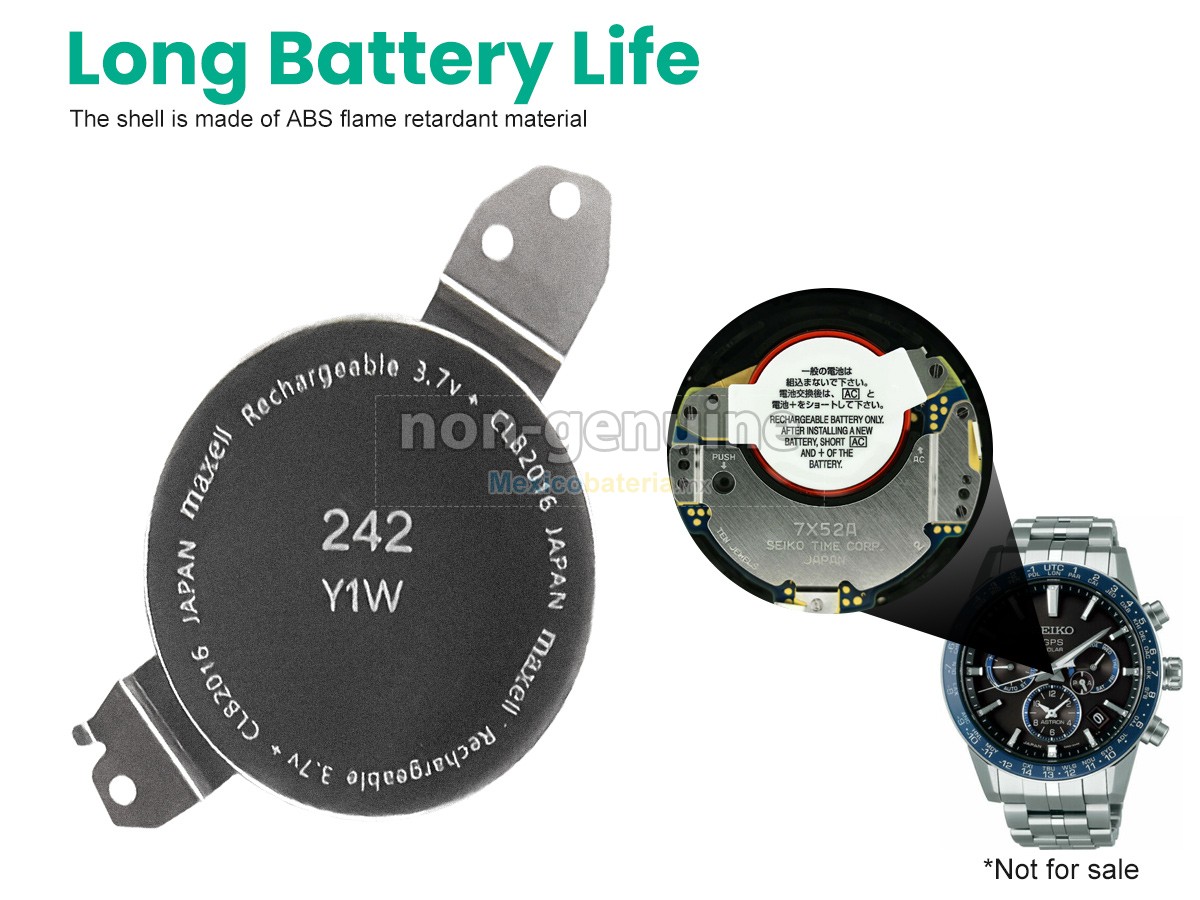 Mexicobateria.mx vende baterías de alta calidad, garantizamos su compatibilidad y mejora del rendimiento de la batería original. Nuestras SEIKO 7X52A batería se producen de acuerdo con los estándares más exigentes y, luego de estrictos procesos de selección y control de calidad, cumple con la Norma CE. Ofrecemos la batería con una mayor capacidad a un precio muy competitivo, su puerto es de material aislado metálico y sólido de alta calidad para garantizar una entrada de corriente estable y su durabilidad. La mejor batería depende de su marca, precio y variedad, en Mexicobateria.mx puede tener todos estos, el producto se envia desde México y 100% seguros para comprar.